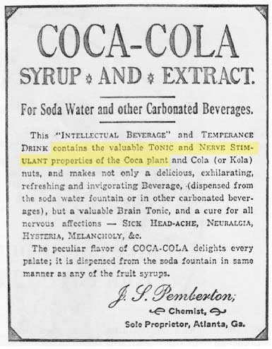 Seguiram-se comercializações em larga escala, como remédios caseiros para a dor de cabeça e como o Coca Vin Mariani (1863), uma mistura de vinho e cocaína vendido para a fadiga e criar sensação de bem-estar, ajudou a popularização da droga na Europa. Em 1886, o farmacêutico John Pemberton de Atlanta cria a receita original da "Coca-Cola” que continha cerca de 2,5 mg de cocaína por 100 ml de solução, tendo conseguido patente como um medicamento. A cocaína passava assim a ser o remédio de eleição para cura de todos os males.